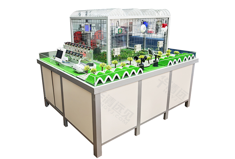 智能农业综合实训系统(FS_ZNNY)主体是一个铝合金金属骨架和有机玻璃墙壁组成的温室系统,与其他感知、控制及执行系统一起,构成完整的温室大棚系统。包括:透明温室大棚、自动遮阳罩、水泵及喷头、仿真植物和真实植物、水循环系统、通风系统、光照调节系统、温度调节系统、无线传感器网络安装位置等。是针对于物联网在农业领域自动化与智能化应用的一款实景模拟系统,依托各种传感节点(环境温湿度、土壤水分、二氧化碳、图像等),和无线通信网络实现农业生产环境的智能感知、智能预警、智能分析、专家在线指导,为农业生产提供精准化种植、可视化管理、智能化决策。为院校在物联网实训教学方面提供了一个真实的农业综合实训系统,使学生在实训中实现对物联网综合技术应用的理解并在此基础上进行创新应用,培养学生创新应用能力,充分满足了目前高校培养物联网技术人才的需求。